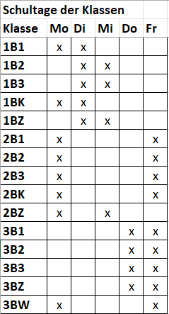 An diesen Schultagen entfällt der Unterricht planmäßig bzw. mit erhöhter Wahrscheinlichkeit. (Ferientage sind nicht aufgelistet.)